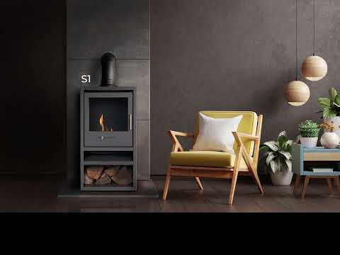 OKO S4 Bio Ethanol Stove with Log Storage in Charcoal Grey with Angled Stove Pipe
